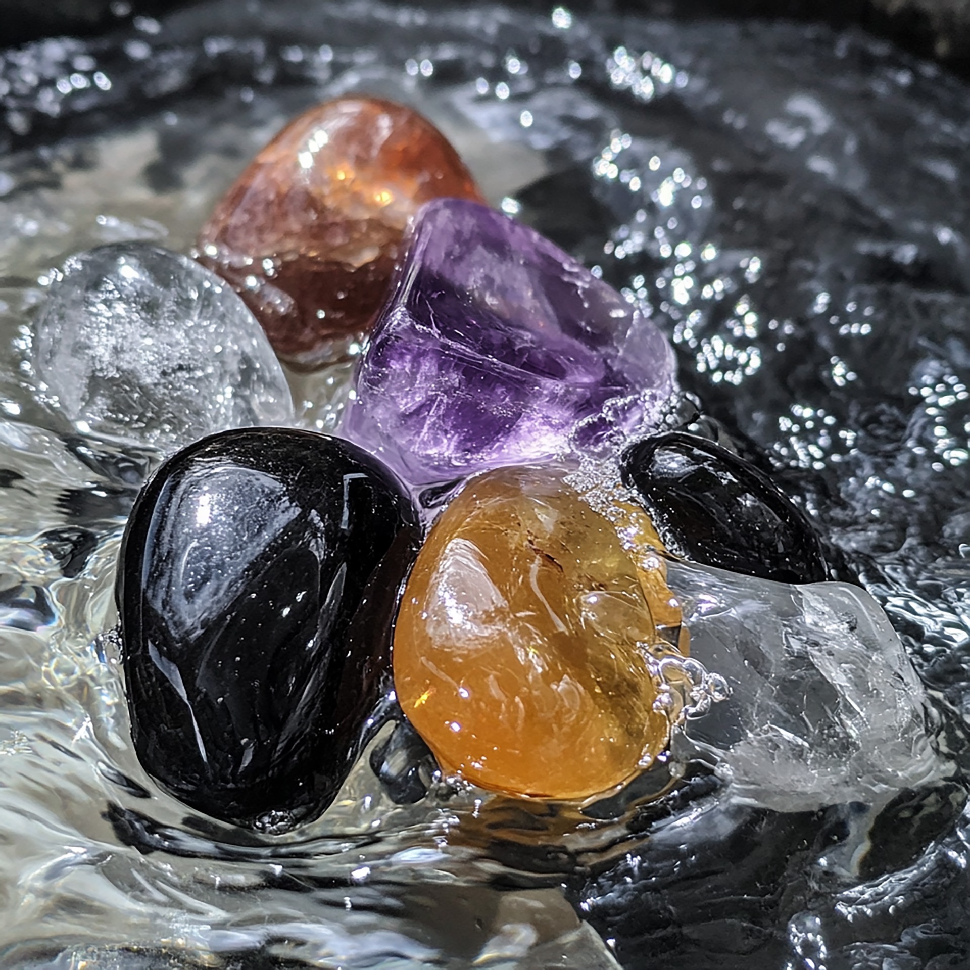 ⚠️ Pozor: Kryštály, ktorých názov končí na "-it" (napr. selenit, malachit, kyanit) často nie sú vhodné na čistenie vodou, pretože sú mäkšie a mohli by sa poškodiť.