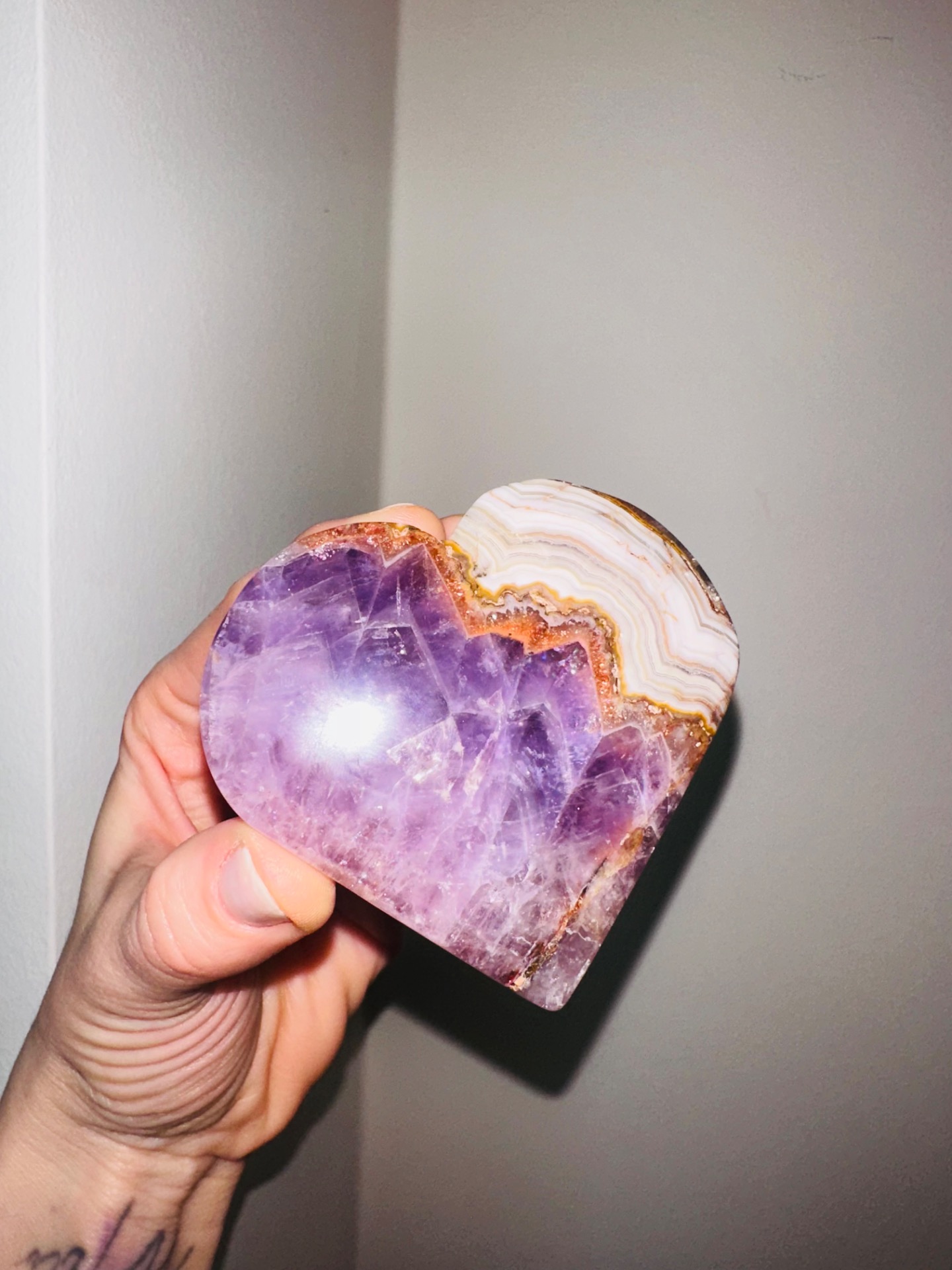Toto výnimočné kamenné srdce je symbolom lásky, harmónie a vnútornej rovnováhy. Spojenie fialového ametystu a jemne vrstveného achátu vytvára jedinečný prírodný originál, ktorý v sebe nesie energiu pokoja, dôvery a hlbokého prepojenia. Každý kus je neopakovateľný – vytvorený prírodou, formovaný časom a dotvorený ručným leštením.