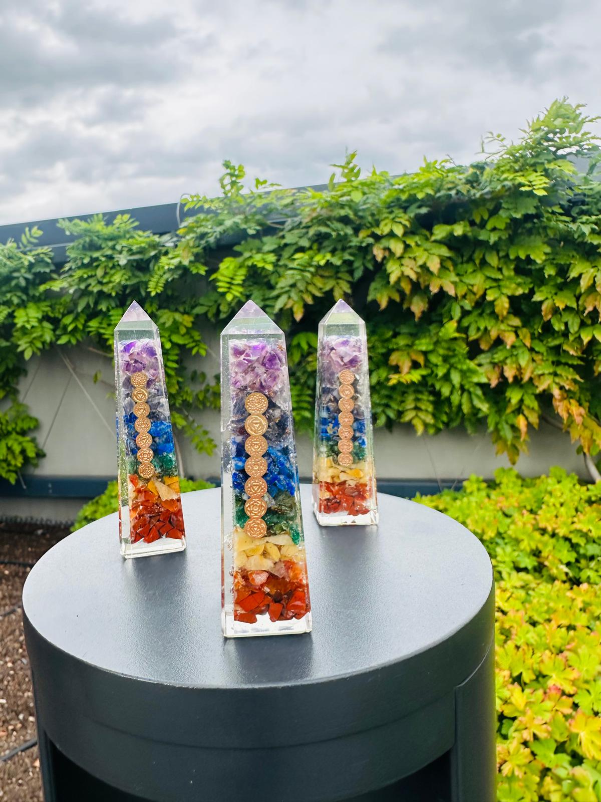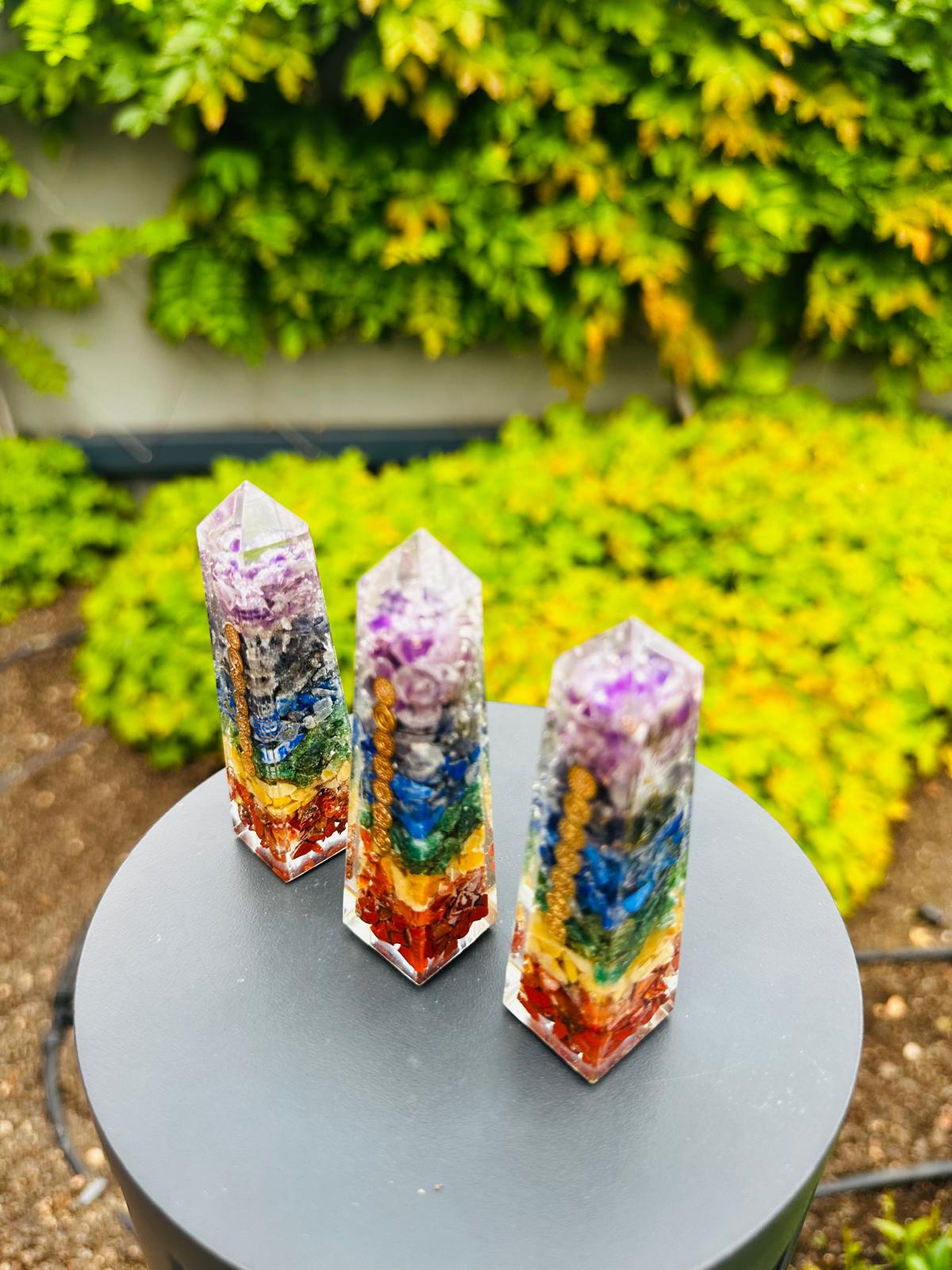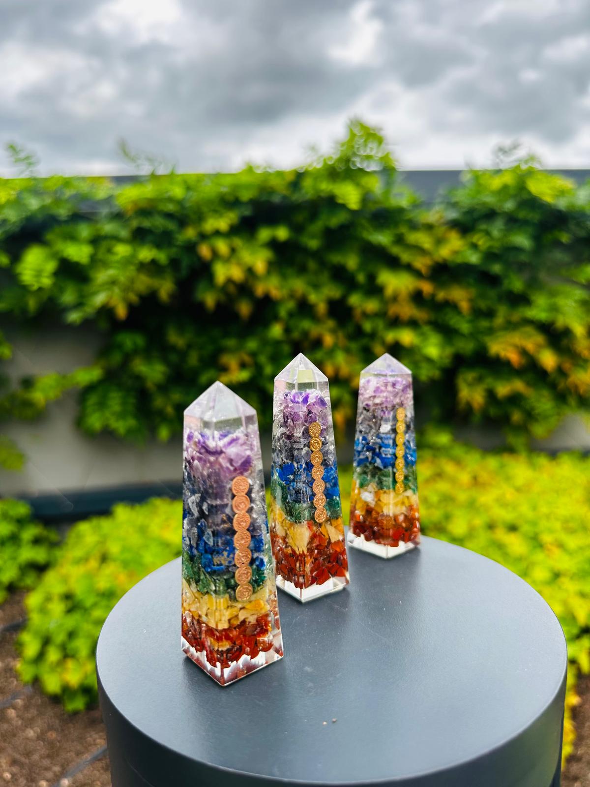 Tento majestátny orgonitový generátor spája silu všetkých siedmich čakrových kameňov. Každá vrstva zodpovedá jednej čakre a postupne otvára cestu k harmónii tela, mysle a duše. Tvar šesťhranného stĺpu sústreďuje a zosilňuje energiu, čím sa stáva ideálnym nástrojom pre meditácie, liečenie a očistu priestoru.