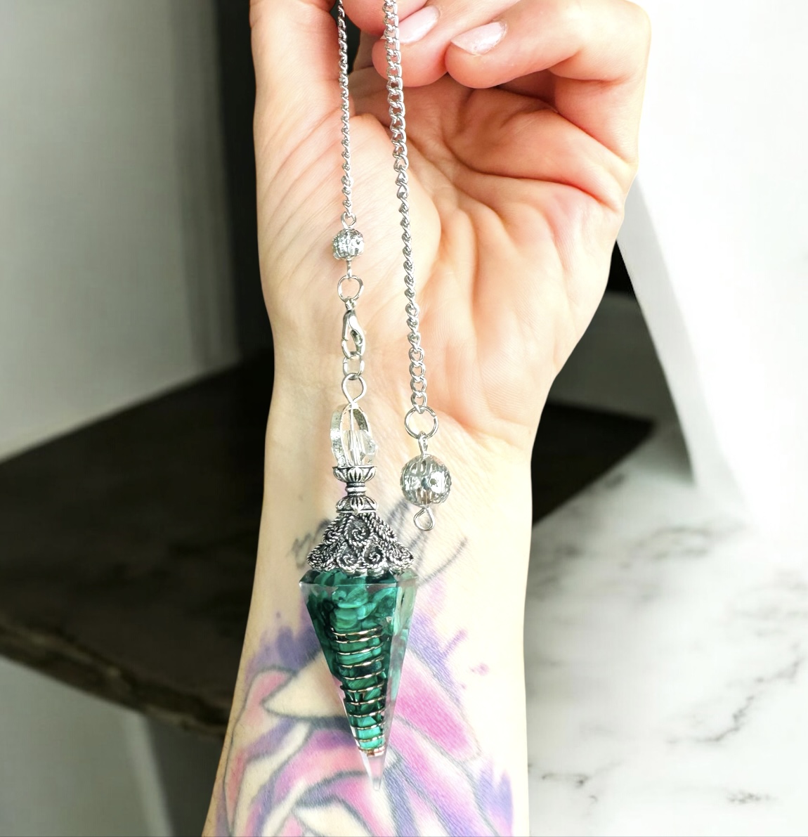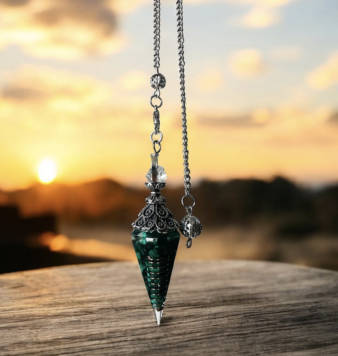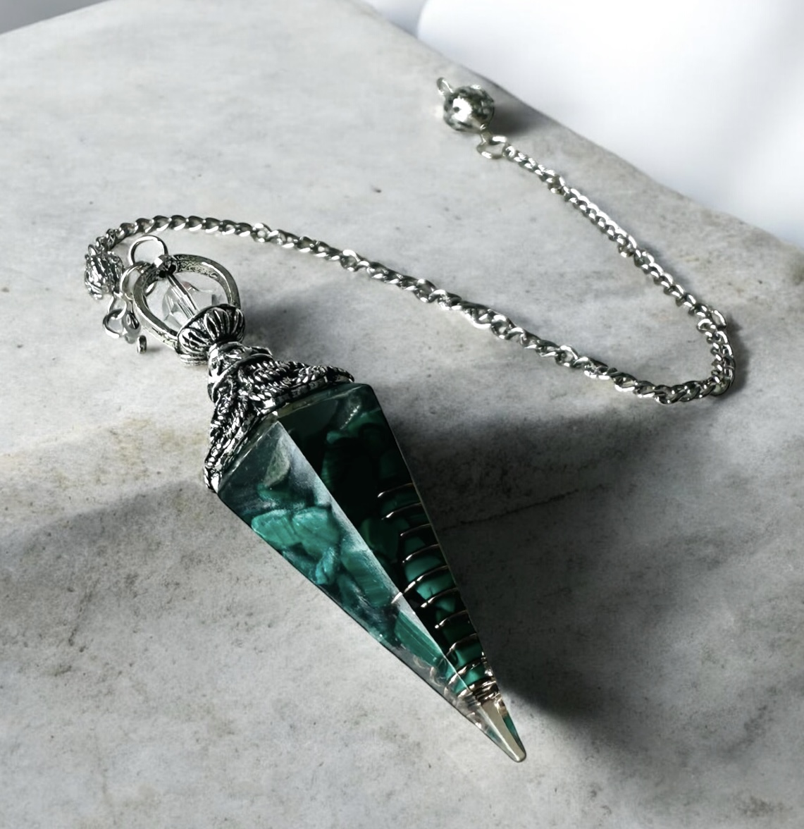 Kyvadlo z prírodného malachitu – sila rozhodnutia, ochrana a transformácia