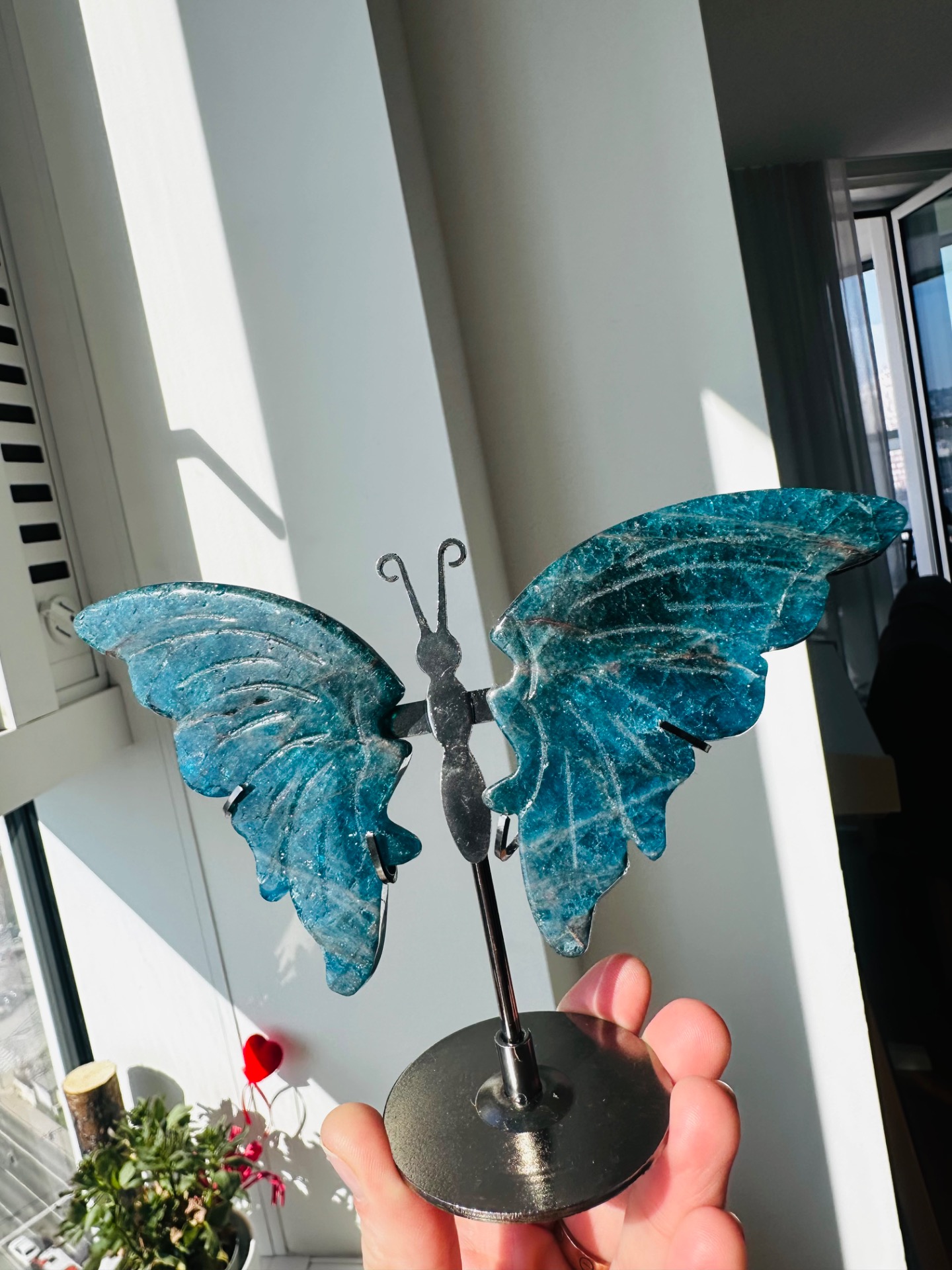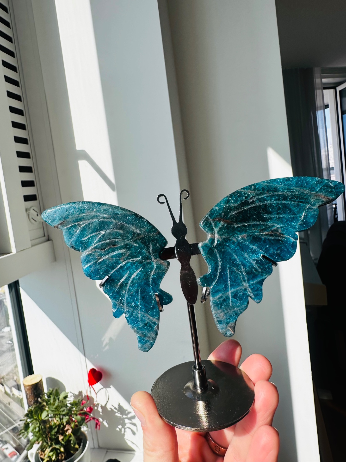 Tento elegantný minerálny motýľ spája jemnosť, duchovnú energiu a prirodzenú krásu kryštálu. Apofylit prináša do priestoru svetlo, pokoj a jasnosť, zatiaľ čo motýľ symbolizuje rast, premenu a nové začiatky.