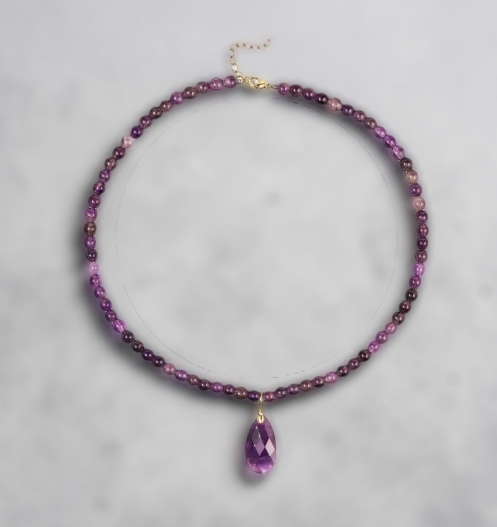 Elegantný náhrdelník vytvorený z prírodného ametystu doplnený brúseným príveskom v tvare kvapky. Tento šperk pôsobí luxusne, žensky a nadčasovo, vďaka čomu je vhodný na každodenné nosenie aj výnimočné príležitosti.