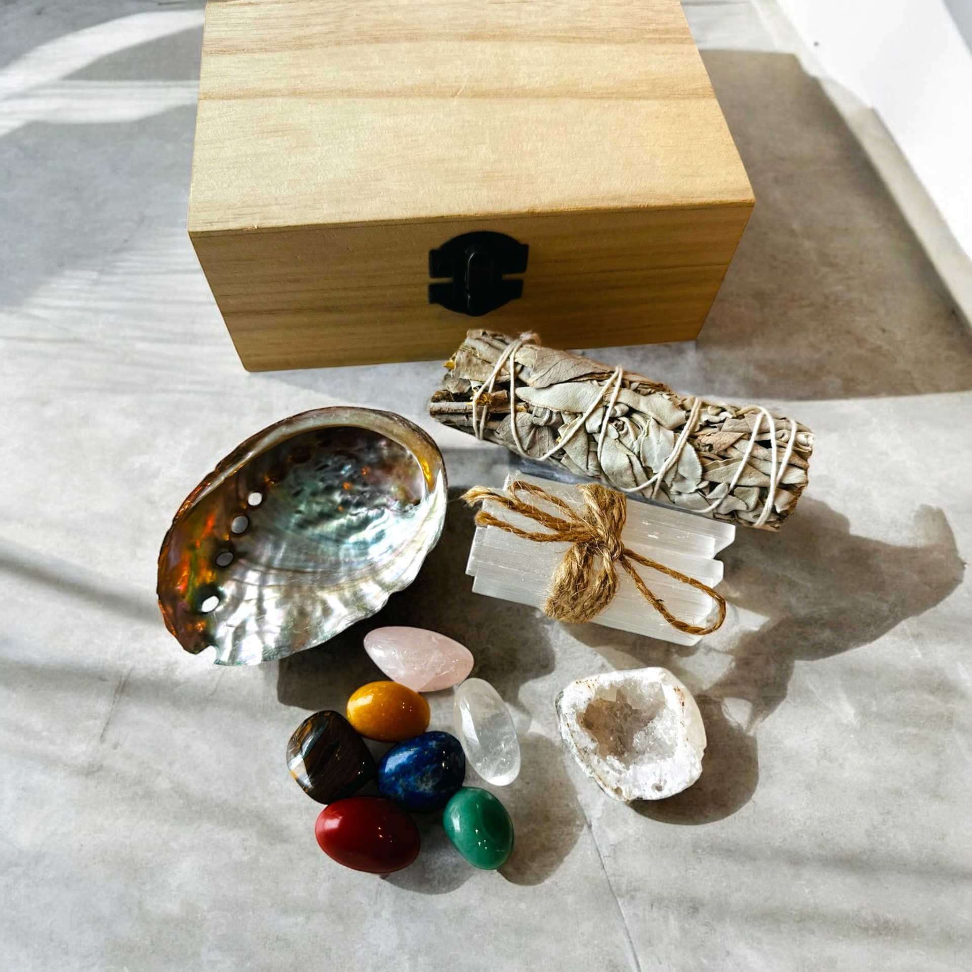 Tento očistný set vznikol pre chvíle, keď cítiš, že potrebuješ spomaliť, uvoľniť napätie a vyčistiť priestor od ťažkej energie. Je to krásna kombinácia prírodných kameňov, šalvie, selenitu a mušle, ktorá ťa vedie k vnútornej rovnováhe a novému začiatku.