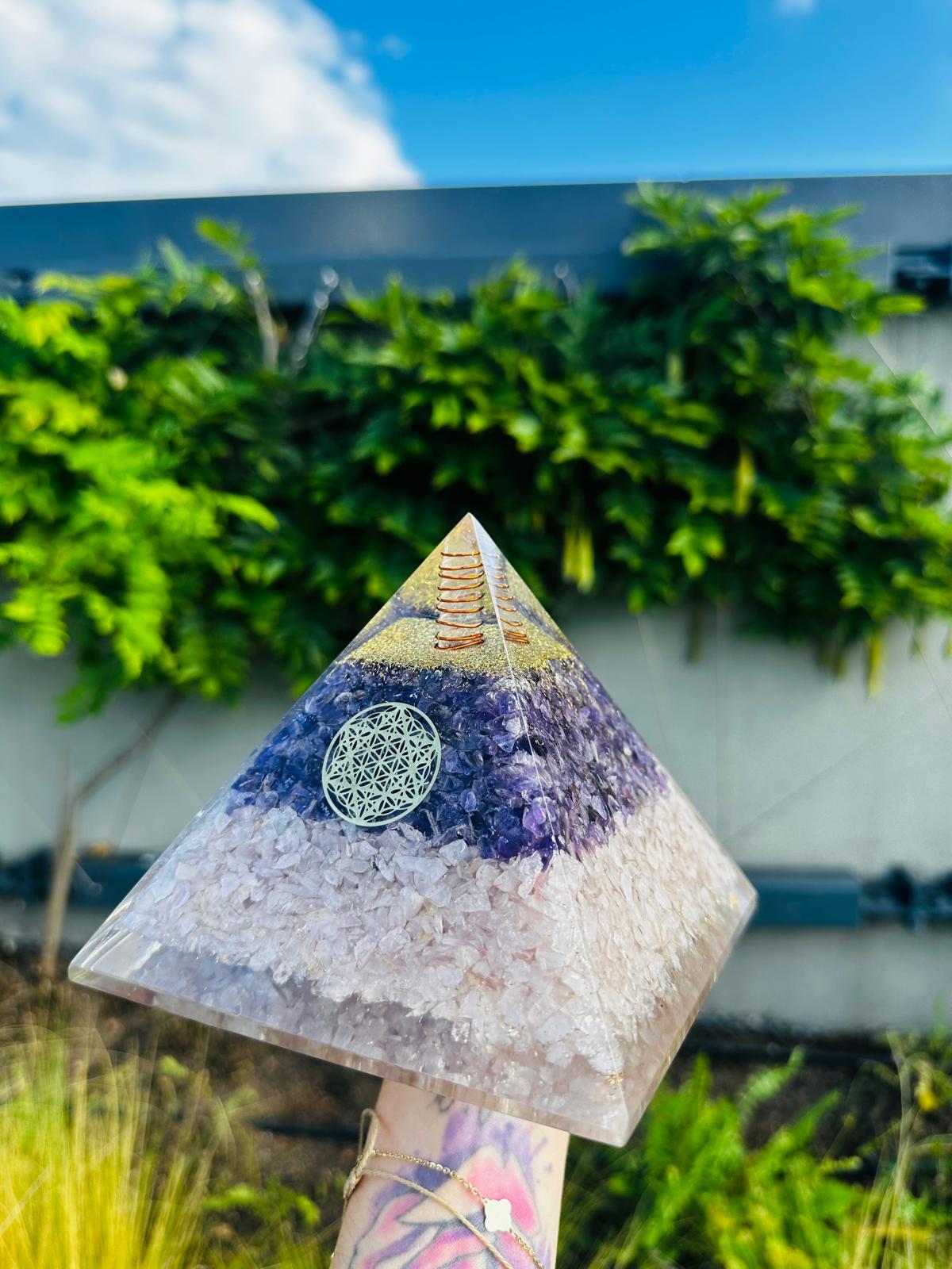 Orgonitová pyramída - CHRÁM LÁSKY - 13cm - Ametyst & Ruženín pyramída s Kvetom života