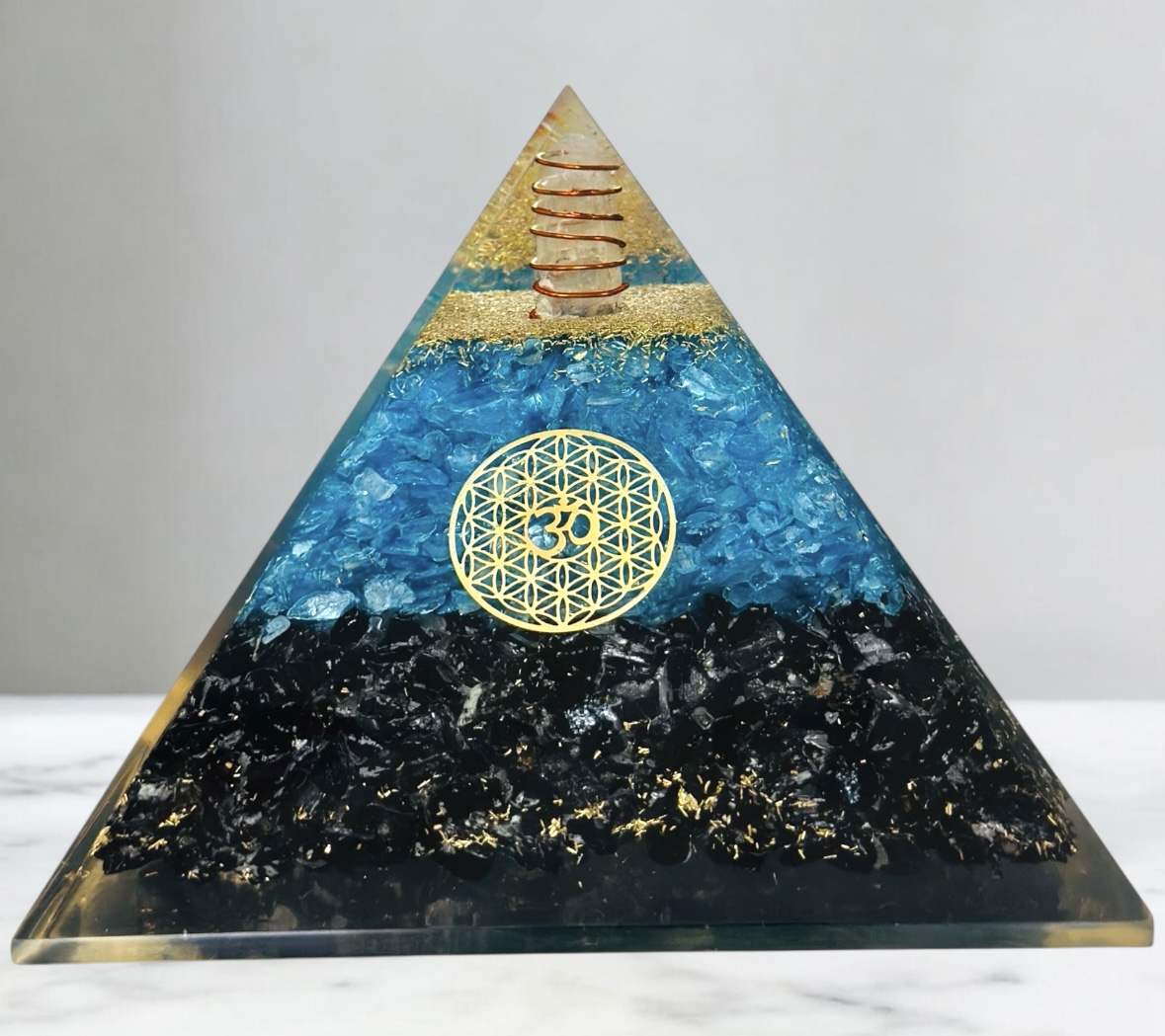Pyramída kombinuje ochranný základ, modrú vrstvu intuície a krištáľ ako zosilňovač energie.