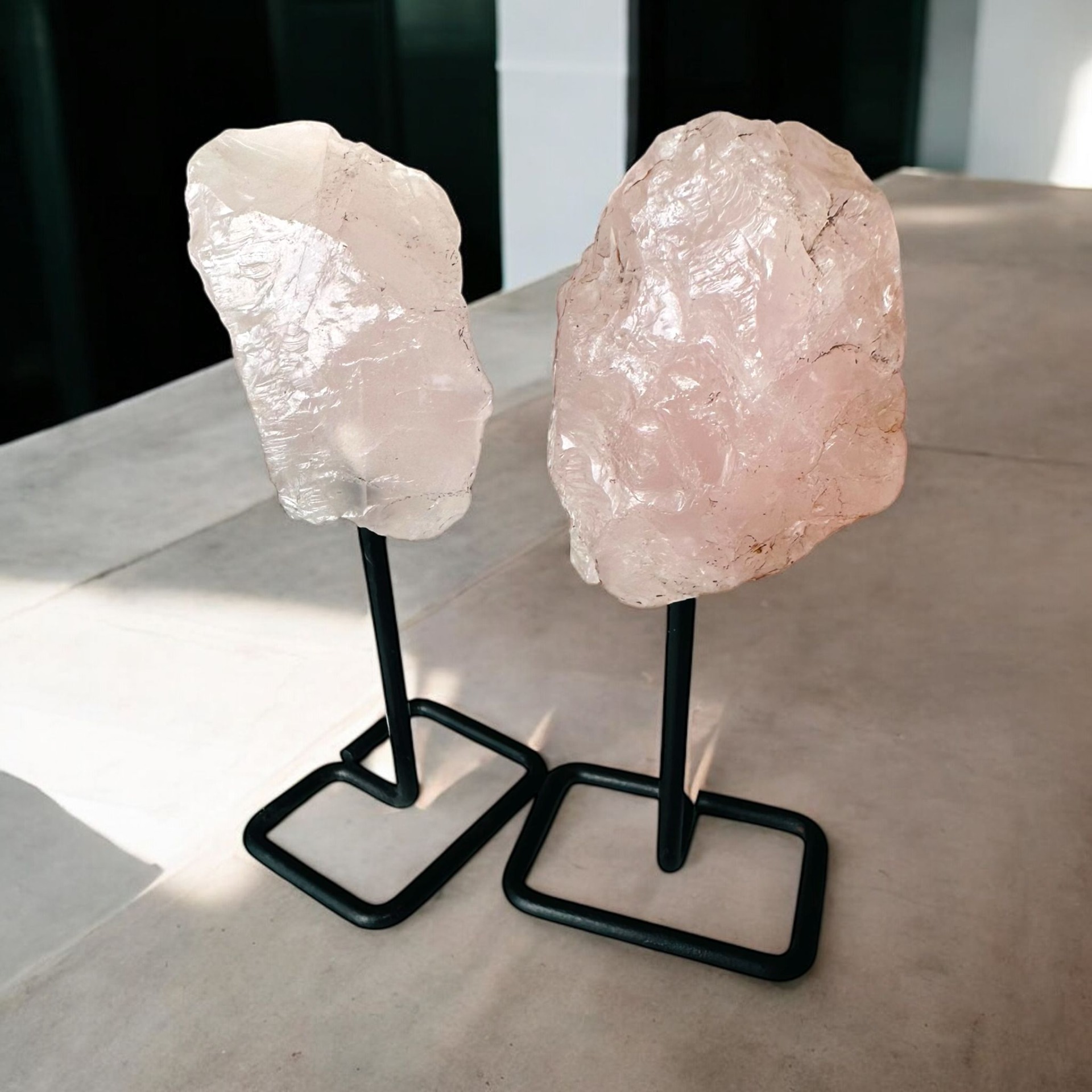 Každý kúsok ruženínu je jedinečný dar prírody, zasadený do elegantného čierneho kovového stojana. Vďaka tomu pôsobí ako dizajnový doplnok aj ako silný energetický kameň, ktorý prežiari priestor jemnou, srdcovou energiou.