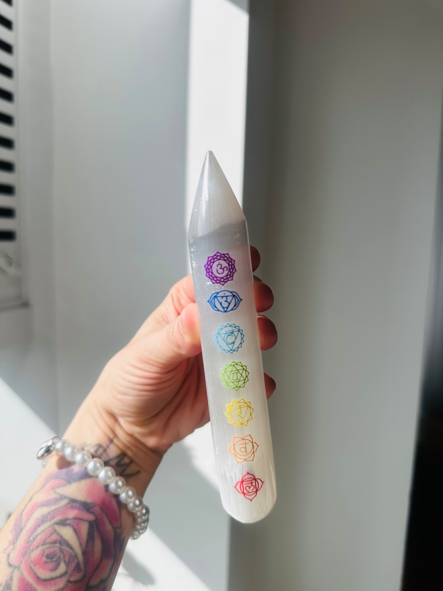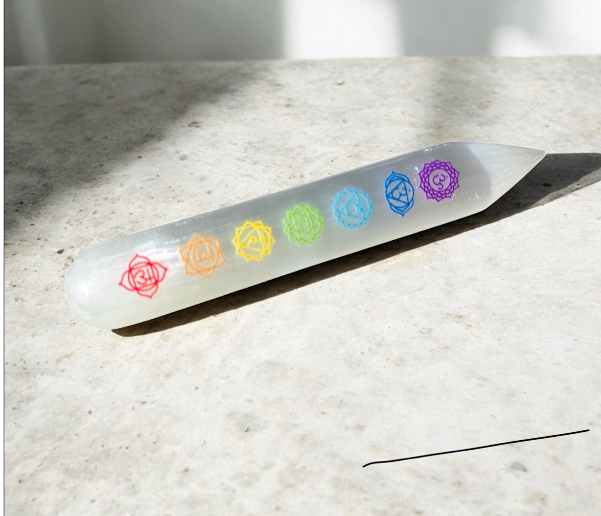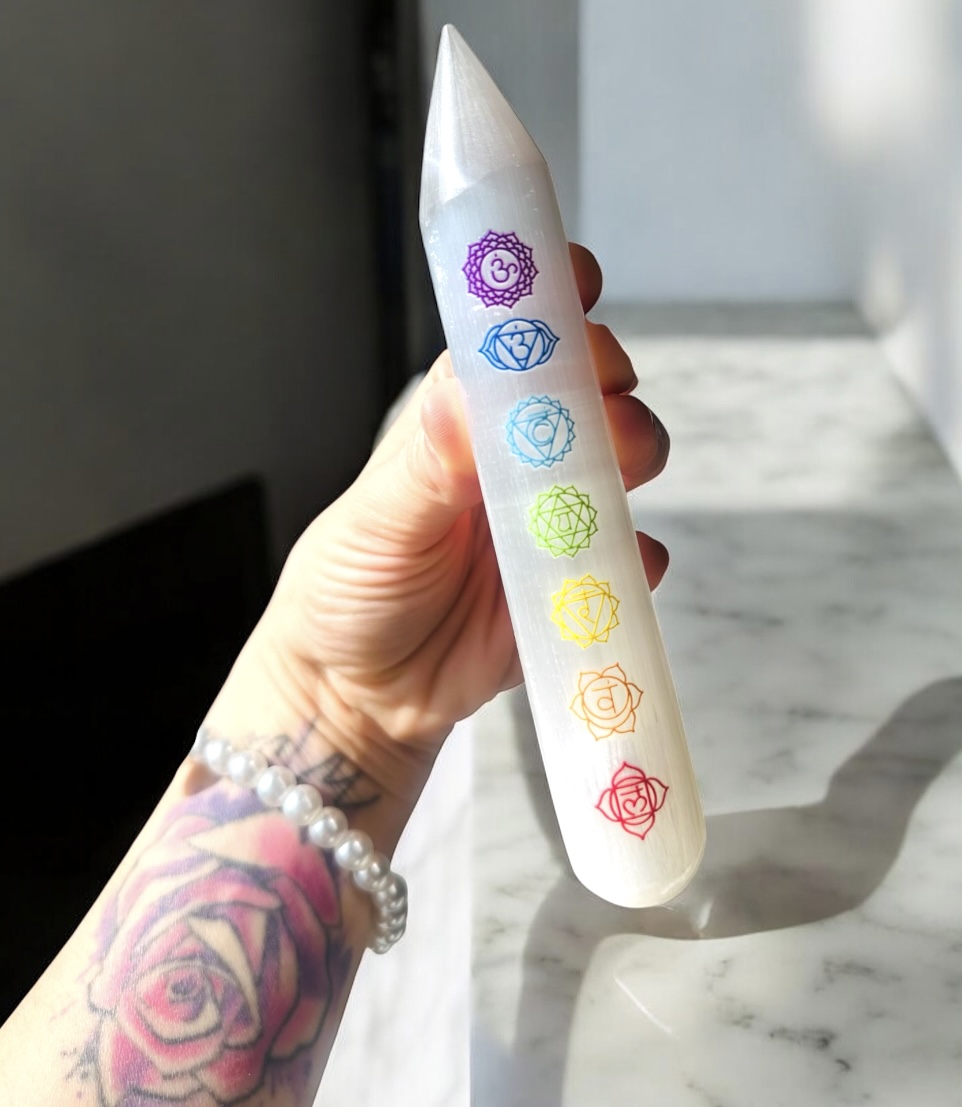 Táto selenitová palica so symbolmi siedmich čakier je silným energetickým nástrojom používaným na harmonizáciu energie, očistu priestoru a podporu vnútorného pokoja. Selenit patrí medzi najčistejšie minerály a je známy svojou schopnosťou jemne čistiť energiu a prinášať do priestoru svetlo, pokoj a rovnováhu.