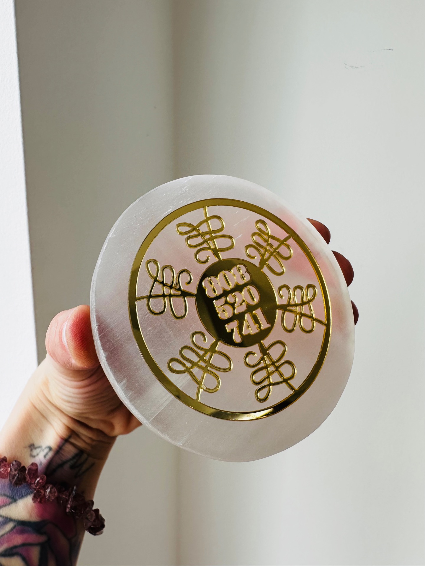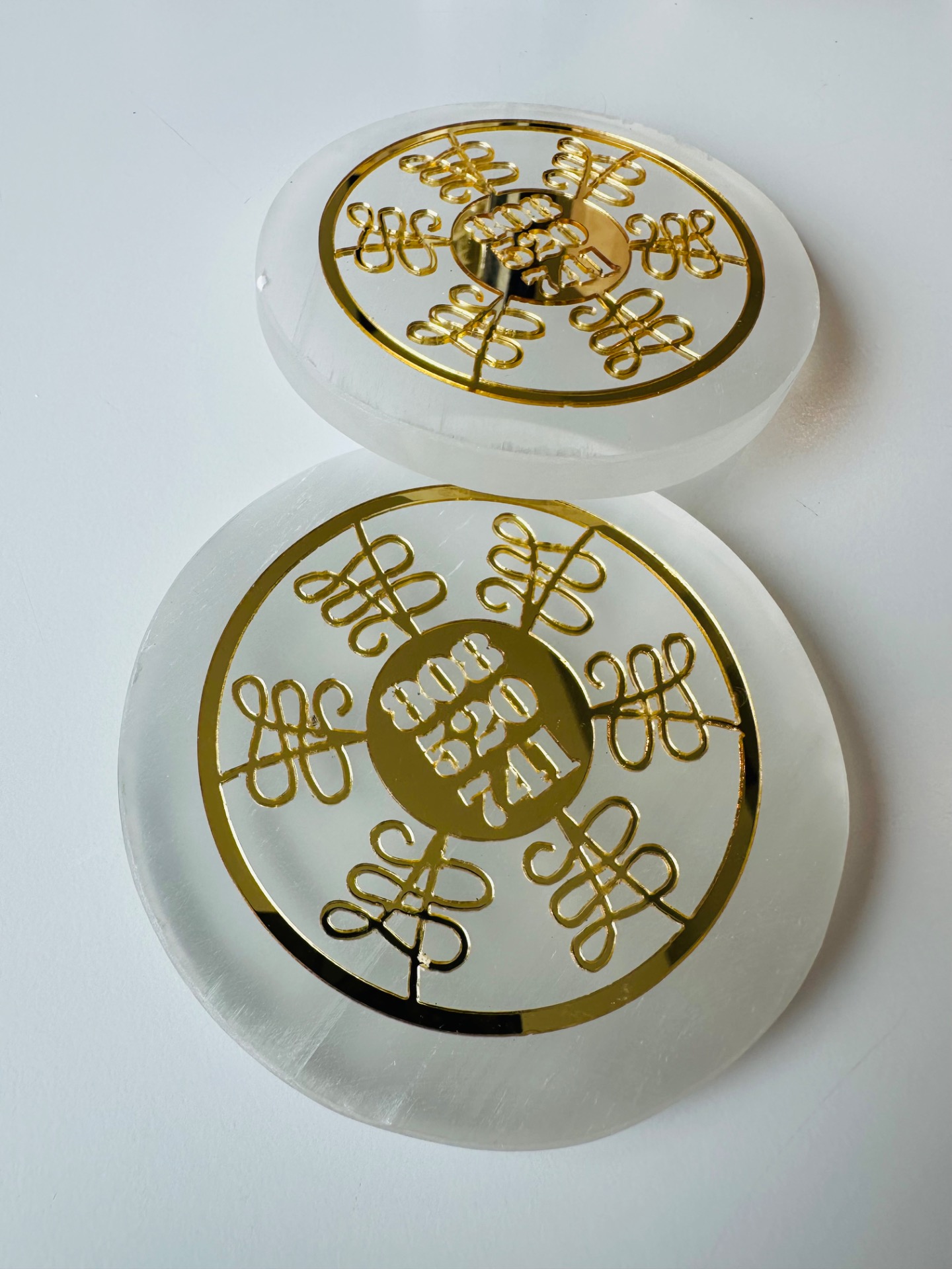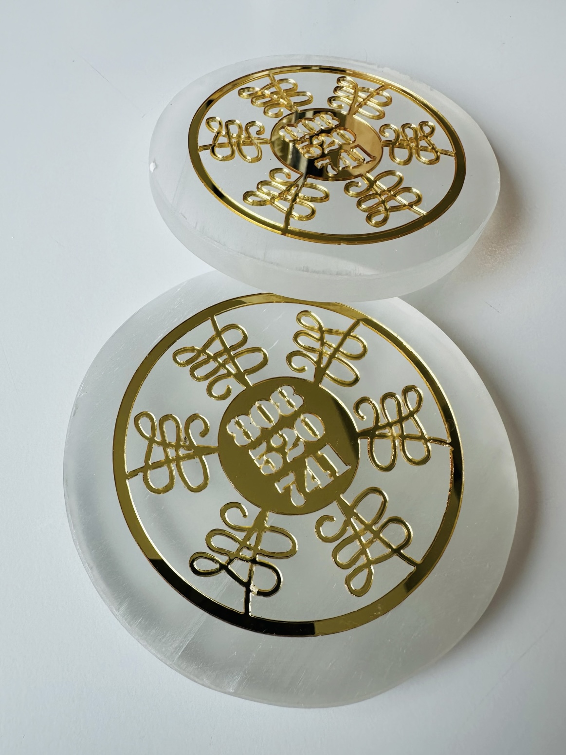 Táto unikátna selenitová platňa obsahuje silný energetický symbol doplnený o číselný kód, ktorý v sebe nesie vibráciu hojnosti, ochrany a vedomej manifestácie.